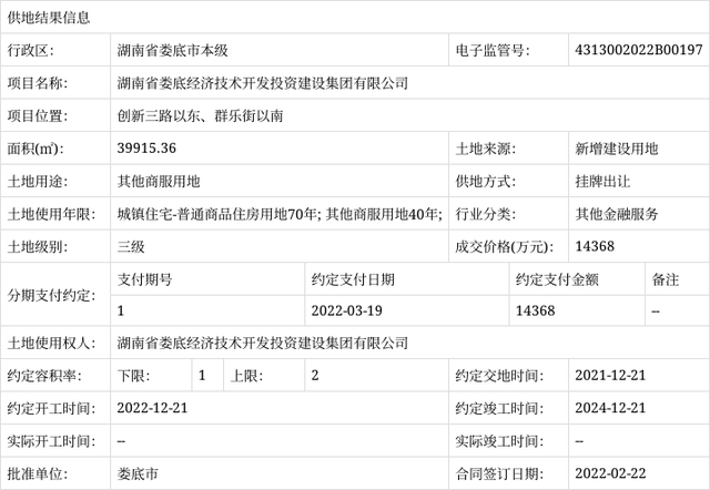 掛牌出讓供地結(jié)果信息(湖南省婁底經(jīng)濟技術(shù)開發(fā)投資建設(shè)集團有限公司-創(chuàng)新三路以東、群樂街以南)
